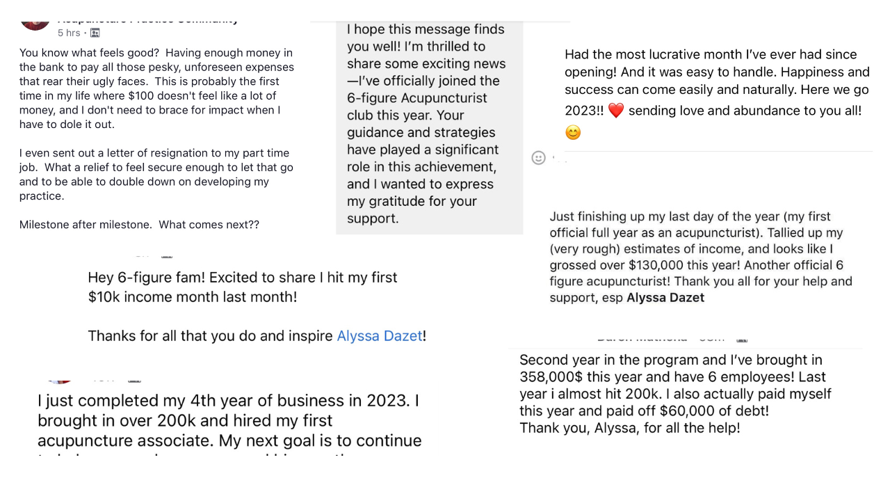 “Before taking the 6-Figure Acupuncturist course I was reaching for patients at most seeing less than 10 patient visits per week, not confident, feeling guilty taking money, discounting, and struggling to start my practice. After taking the course it only took 2 months to triple my weekly patient visits to over 30 visits per week, and my confidence was completely boosted because Alyssa gave me a clear plan of action and protocol of how to clearly educate the patients so that they utilize acupuncture properly, something we were not taught in school. Alyssa helped me realize the true value of what we do, which gave me the confidence to not only help myself and my practice but my patients as well! Now, a full year after taking the program, I can officially say I'm grossing over 6-figures! This Program is a driving force in the acupuncture community. Mainstreaming Eastern Medicine here we go!!! Thank you so much Alyssa Dazet!”